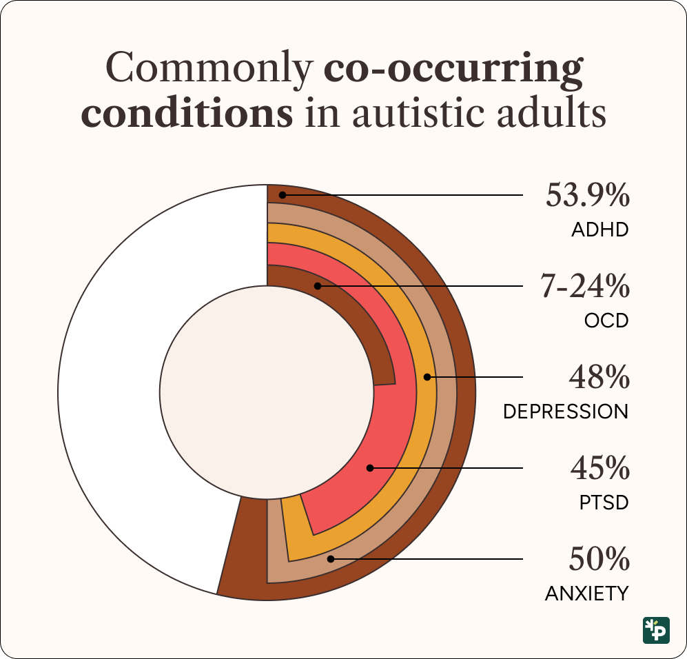 For many autistic adults, this gap in resources can make getting help daunting—but all the more important. Autistic adults are more likely to be diagnosed with a mental illness––between 40 and 50% of autistic individuals have or have had anxiety, and as many as 40% have or have had depression, compared to 18.2% and 21.4% of all US adults, respectively. Even more worrying, 66% of late-diagnosed autistic adults reported experiencing suicidal ideation at some point in their lives. Stigma and a broad social failure to accommodate autistic needs are likely drivers of poorer mental health outcomes among autistic adults.